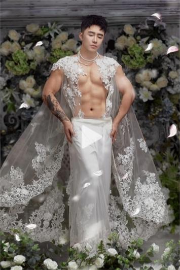 半透明的婚纱,隐隐约约可以看到丁瑜升蜜色的皮肤,健壮的肌肉厚实却不夸张,蜂腰细窄,尽管是身穿婚纱,却没有丝毫的女气和阴柔,反倒是有一种俊美无双的英气。